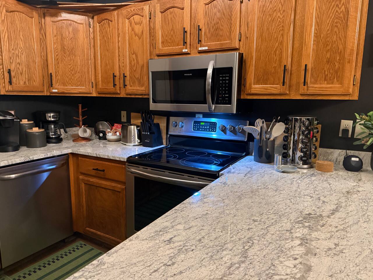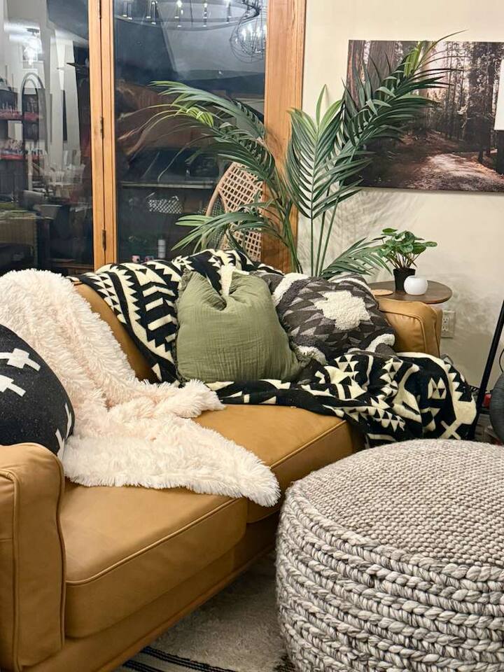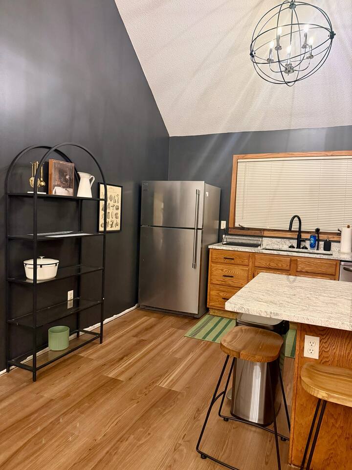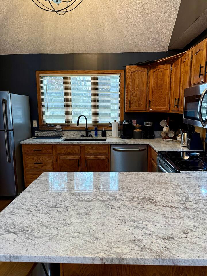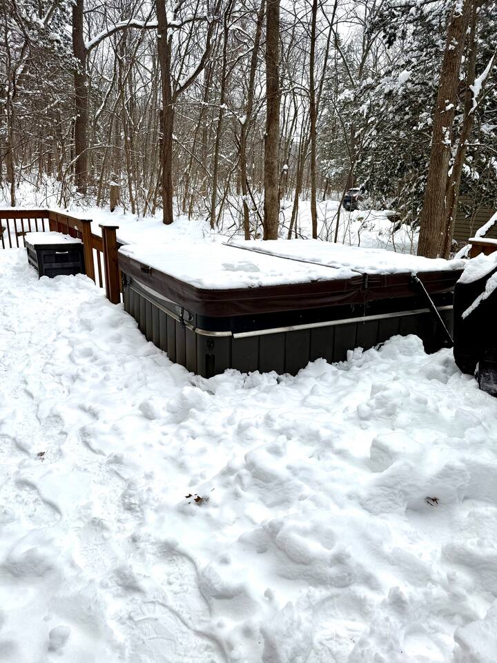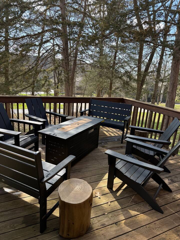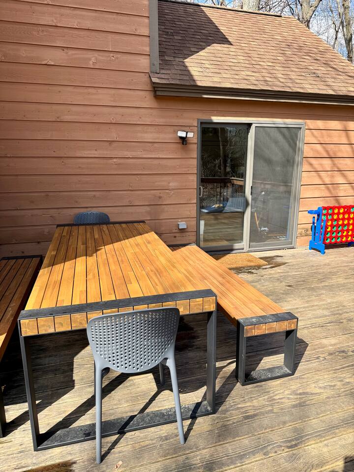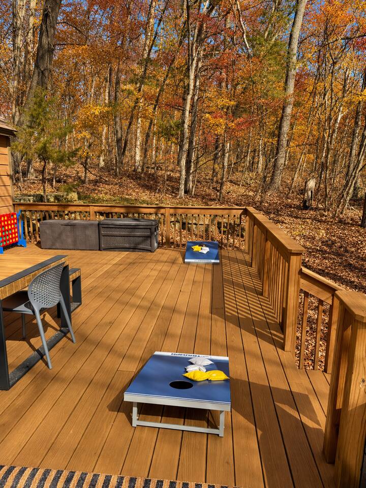 Ideal for large families or multiple couples | Family-run | Private wooded setting | Hot tub | Fast WiFi | Paved road access | Indoor gas fireplace | Free breakfast ----------------------------------------------------------- Welcome to Canterbury Peaks, a cozy 4-bed, 4-bath cabin retreat designed for families and groups who want the perfect blend of comfort, adventure, and togetherness. Thoughtfully styled with a warm, atmospheric cabin aesthetic by akm designs, this home offers inviting gathering spaces, family-friendly amenities, and plenty of room for everyone to relax and play. ----------------------------------------------------------- Designed for Families & Groups Step inside to a wide-open living + dining + kitchen layout that brings everyone together. The large dining table seats 10 comfortably—perfect for shared meals, holiday feasts, or long board-game nights! The living room offers plush seating for 8+, a cozy gas fireplace, 65" TV, and a digital infinity game table with dozens of board games that keep all ages entertained. Also enjoying strumming a few tunes on the guitar (Christmas and Campfire music books available) or listening to some vintage tunes on the record player! ----------------------------------------------------------- Fully Equipped Kitchen + Free Breakfast Cook with ease in a fully stocked kitchen featuring stainless steel appliances, waffle maker, blender, spices, and both Keurig and drip coffee makers. Start your morning with free waffle mix and syrup—a family favorite! ----------------------------------------------------------- Spacious Bedrooms for Everyone -Primary Suite: King bed, desk, jetted tub, and walk-in shower -Bedroom 2: King bed + hall bath with tub/shower -Bedroom 3: King bed, desk/workspace + attached bath with tub/shower. -Bedroom 4 (Kids’ Bunk Room): Two bunk beds, 2 TVs, 2 Xbox consoles with Game Pass, and a classic arcade machine with 10 games—endless fun for kids and teens. Bathroom in hall with tub/shower. ----------------------------------------------------------- Outdoor Fun & Relaxation Spread out across 1 private acre of wooded scenery. Enjoy: -A bubbling hot tub for post-ski or post-hike relaxation -Patio table seating 10 + grill for easy meals outside -A screened porch with cozy seating for 8+ -A large deck with games and play space -A future (Spring 2026) gas fire pit area with seating for 8+ -Tons of yard games—bocce, croquet, giant Connect 4, disc golf, bowling, yard dice, Kan Jam & more! ----------------------------------------------------------- Family-Friendly Comfort We’ve made traveling with young kids easy—with: -High chair -Pack ’n play -Baby bath -Kid-safe plates, bowls, cups & utensils -Toddler toys -Flat outdoor areas for safe play ----------------------------------------------------------- The Perfect Base for Galena Territory Adventures Whether you're planning a multi-family getaway, couples’ trip, or a big family gathering, Canterbury Peaks puts you close to golfing, hiking, skiing at Chestnut Mountain, horseback riding, pickleball, boating, and scenic trails. Create unforgettable memories in a space designed for joy, comfort, and connection. Your Galena Territory adventure starts at Canterbury Peaks!